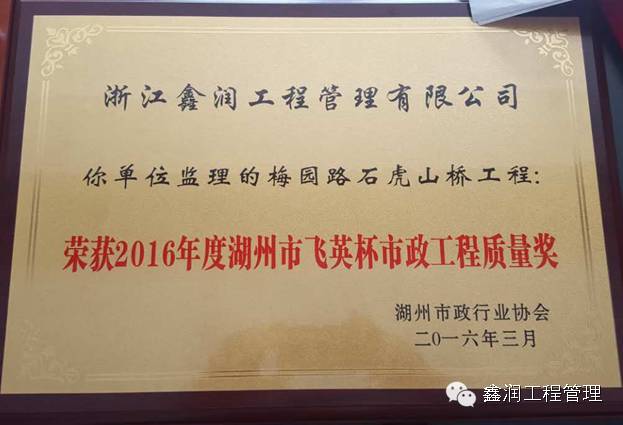 我單位監理的梅園路石虎山橋工程榮獲"2016年度湖州市飛英杯市政工程質量獎"
