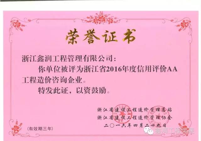 經過市造價管理機構(造價管理協會)對企業現場考核評定和省造價管理總站聯合省造價管理協會組織專家對上報資料進行復核抽查后,浙江鑫潤工程管理有限公司被評為浙江省2016年度信用評價AA工程造價咨詢企業。